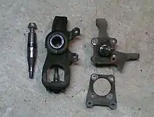 Spindles are carried by steering knuckles or "uprights".[1] Although, the terms "steering knuckle" and "upright are sometimes used interchangeably with "spindle", they refer to different parts.[2]