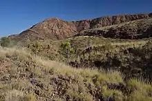 The spinifex pigeon occurs throughout much of arid and semiarid northern and central Australia. It lives in arid and semi-arid stony habitats on rocky hills and mountainous terrain, gorges, dry rocky creek beds and nearby gibber plains.[3][5][6][7] It occupies environments which often experience extreme heat during the day, extreme cold during the night, high seasonal fluctuations in rainfall, and extended periods of severe drought.[8] This species is most often encountered in habitats containing hummock forming grasses of the Triodia and Plectrachne genera, which are colloquially referred to as ‘spinifex grasses’.[3] These grasses may form extensive areas of grassland in comprise the understorey component of low open savannah and woodlands of Desert Oak (Allocasuarina decaisneana), Eucalypts and Mulga (Acacia aneura). Although strong associations with spinifex are reported, in some areas it is rarely sighted in spinifex and prefers other types of sparse grassland.[3]
