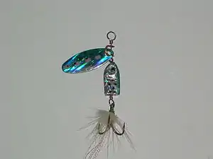 A spinnerbait is any of a family of fishing lures that get their name from one or more metal blades shaped so as to spin like a propeller when the lure is in motion, creating varying degrees of flash and vibration that mimic small fish or other prey. The two most popular types of spinnerbaits are the "in-line spinner" and "safety pin" spinnerbaits, though others such as the "tail-spinner" also exist. Spinnerbaits are used principally for catching predatory fish such as perch, pike and bass.