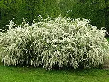 Spiraea × cinerea is a species of flowering plant in the rose family. It is a hybrid of garden origin (S. hypericifolia × S. cana). Growing to 1.5 m (4.9 ft) tall and wide, this compact deciduous shrub bears small, lanceolate leaves and multiple white blooms along its arching stems in spring.
