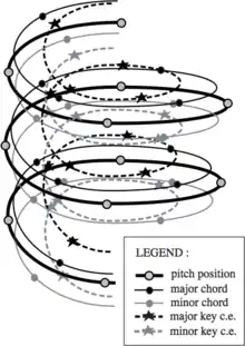 In music theory, the spiral array model is an extended type of pitch space. A mathematical model involving concentric helices (an "array of spirals"), it represents human perceptions of pitches, chords, and keys in the same geometric space. It was proposed in 2000 by Elaine Chew in her MIT doctoral thesis Toward a Mathematical Model of Tonality.[1] Further research by Chew and others have produced modifications of the spiral array model, and, applied it to various problems in music theory and practice, such as key finding (symbolic and audio[2][3]), pitch spelling,[4][5][6][7] tonal segmentation,[8][9] similarity assessment,[10] and musical humor.[11] The extensions and applications are described in Mathematical and Computational Modeling of Tonality: Theory and Applications.[12]