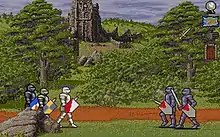 When two different groups meet, the player is shown a scene depicting a side view of all characters present at that location. Dialogs, individual combat, exchanges of objects, and requests for information all take place at the scene level. During the fights on this level, one of the player controlled characters combats one of the enemies. The fight ends when all the elements of a group are dead or have withdrawn. The player can choose whether to activate an automatic control or fight manually and he can also have any of his characters use an object or a magician cast a spell. Individual combat ensues between characters who are not supported by an army, but upon a meeting between two hostile armies a specific combat screen opens. If the player has control over one of the two sides, he can issue commands to his units, for example ordering a group of soldiers to charge the enemy, some knights to flank the adversary of have one of the Knights of the Round Table use an object.