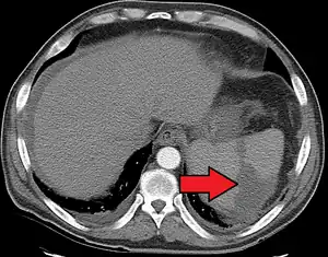 Splenic infarction is a condition in which blood flow supply to the spleen is compromised,[1] leading to partial or complete infarction (tissue death due to oxygen shortage) in the organ.[2] Splenic infarction occurs when the splenic artery or one of its branches are occluded, for example by a blood clot.[3]