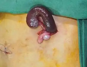 | Intra-operative gross photograph of the spleen attached to the left testis in a 1-year old boy with splenogonadal fusion |