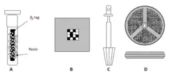 Modifications had been developed enabling the split and pool synthesis to produce known compounds in larger quantities than the content of a bead of solid support and retain the high efficiency of the original method. As published by Moran et al.[25] and Nicolau et al.[26] the resin normally used in the solid phase synthesis was enclosed into permeable capsules including a radiofrequency label recording the BBs in order of their coupling. Both manual and automatic machine was constructed to sort the capsules into the appropriate reaction vessels. A different kind of labeled macroscopic solid support unit was introduced by Xiao et al.[27] The supports are 1x1 cm polystyrene grafted square plates. The medium carrying the code is a 3x3 mm ceramic plate in the center of the synthesis support The code is etched into the ceramic support by a CO2 laser in the form of a two-dimensional bar code that can be read by a special scanner.