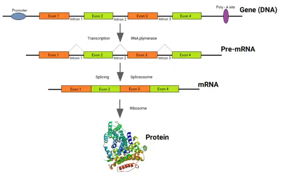 Genes of all organisms, except bacteria, consist of short protein-coding regions (exons) interrupted by long sequences (introns).[1][2] When a gene is expressed, its DNA sequence is copied into a “primary RNA” sequence by the enzyme RNA polymerase. Then the “spliceosome” machinery physically removes the introns from the RNA copy of the gene by the process of splicing, leaving only a contiguously connected series of exons, which becomes messenger RNA (mRNA). This mRNA is now read by the ribosome, which produces the encoded protein. Thus, although introns are not physically removed from a gene, a gene's sequence is read as if introns were not present.