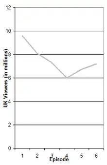 The Spooks producers were hoping the ratings for the pilot would achieve at least six million viewers; at the time this was considered acceptable ratings by the BBC, as it would allow them to further consider Spooks' future.[34] The first episode ended up with an overnight rating of 9.2 million viewers, with a 41 per cent audience share, easily winning its time slot, and nearly doubling the numbers of ITV1's Helen West, which was viewed by 4.8 million at the same slot.[35] The second episode dropped to 7.8 million, but was still the most seen series in the timeslot.[36] Although the series won its timeslot again in the third episode, "One Last Dance" faced competition from The Kumars at No. 42 on BBC Two, and was down to seven million.[37] The different timeslot for episode four meant that it dipped below six million;[29] however, ratings recovered to over seven million by the series finale.[38] With consolidated figures factored in, the first series was seen by an average of 7.49 million viewers.[n 1] After two episodes aired, the BBC began considering renewing the show for a longer second series as it had proved popular among the key demographics of viewers aged 16 to 34 years.[39] The renewal was officially announced by the BBC's Head of Drama Commissioning Jane Tranter in December 2002.[40]