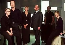 The first series also sees a number of recurring characters and guest appearances. Rory MacGregor appears in two episodes as Colin Wells, an MI5 technical officer.[1] American actress Megan Dodds appears in the first episode as CIA liaison Christine Dale. The producers were impressed enough by Dodds' performance that they wished to see her return in the second series.[11] Kevin McNally appears as Robert Osbourne, the antagonist of the second episode. The producers felt the actor was suitable for the role, as was the case with Debra Stephenson, who played his wife Claire.[12] In the fourth and fifth episodes, Hugh Laurie appears as Jools Siviter, a department head of MI6, an organisation depicted as "old school" compared with MI5.[13] Laurie based his performance on Barry Foster's portrayal of the head of MI6 in Sweeney!.[4] Meanwhile, also in episode four, Anthony Head, best known for his work on Buffy the Vampire Slayer at the time, played Peter Salter. Despite his status as a former Buffy regular, Head still had to earn the role from his audition.[14]