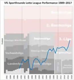 Lotte reached the Verbandsliga Westfalen (V) in 1996 and after a title there in 2004 were promoted to the Oberliga Westfalen (IV), later Regionalliga West. They won that league in 2012–13 but lost the promotion play-off to RB Leipzig. In 2013–14, the club finished in second place. They won the Regionalliga West once more in 2015–16 and, after defeating Waldhof Mannheim in the play-off, earned promotion to the 3. Liga for the first time.[1] On 18 May 2019, they were relegated back to the Regionalliga.[2]