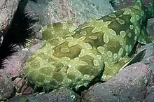 A nocturnal species, the spotted wobbegong feeds at night and rests in sandy bottoms, coral reefs, and coastal bays in the day.[4] Adults most commonly occur on algae-covered rocky reefs and meadows of sea grass or sand, while juveniles are mostly found in estuaries.[5] Because of the species' colour pattern, it camouflages well on rocky bottoms. Although it has not been confirmed, the species may always return to a single site repeatedly throughout its life. Its diet consists of fishes, including luderick, scorpionfishes, basses, and rays, and various invertebrates, such as crabs, lobsters, and octopuses. Like all wobbegongs, it has a short mouth and broad pharynx, which allow it to suck up prey more easily. The species' prey have been known to wander right up to it, including near its mouth, sometimes nibbling its tentacles.[10]