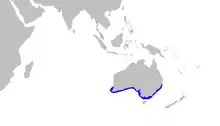 The spotted wobbegong is endemic to Australia, usually living in tropical waters no deeper than 218 metres (715 ft).[1] 38 specimens caught from 1882 to 1995 were found in waters 20–176 metres (66–577 ft) deep.[5] Sightings have been reported in Queensland, Victoria, South Australia, and Western Australia, in the western Pacific Ocean and eastern Indian Ocean. Records are also known of the species living in Tasmania and the Northern Territory, but these are likely to be invalid. Some records have misidentified other fish species living in Japan and the South China Sea as this species.[1][4]