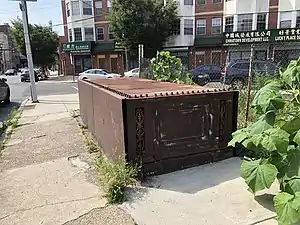 The Broad-Ridge Spur, including Spring Garden station, opened on December 21, 1932.[1] By the late 1980s, Spring Garden station was lightly used and exit-only; it was frequently occupied by drug users and dealers. After no substantial opposition from nearby residents, SEPTA closed the station on September 10, 1989.[2][3] The former station, visible from passing trains, is heavily graffitied.[4] A single entrance, covered with steel, is still present on the west side of Ridge Avenue just north of Buttonwood Street.[5]
