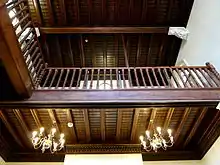 Two original first-floor fireplaces survive. One of these has an over-painted stone surround and mantelpiece, and a hearth surfaced with Arts and Crafts tiles.[27] The other one in the music room is a large and decoratively carved oak affair, with matching doorways either side. These doors open into a dressing room, allowing the fireplace to be a backdrop for performances.[28] The doors and fireplace contain half-columns and pediments in a semi-neoclassical style, with a carved frieze of fruit and leaves, and the helmeted head of St Cecilia, patroness of musicians.[29] The hearth contains a hand-made Arts and Crafts cast iron hood and moulded, coloured ceramic tiles on the surround. The hearth's floor tiles have been removed. The music room has a carved, oak dado, and a decorative plaster ceiling with ceiling roses which double as ventilators, and there are the original wooden beams designed to support the heavy hung ceiling.[28][30]