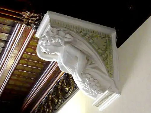 The dark-varnished and galleried staircase retains faded gilding and stencilled motifs on its first floor ceiling and on the underside of the first landing, visible from the ground floor. The decorative, carved frieze around these ceilings also still has old and faded gilding.[21] The newel post is of unusual design.[22] There are four carved wood and plaster corbels supporting the first floor staircase ceiling. They represent a woman with grapes and flowers, a winged cherub, a man with harvest motifs and a full-bearded man in medieval costume, carrying scrolls.[21][23][24][25] In the latter corbel which overlooks the stairwell, the bearded man's profile is similar to Barber's profile in his portrait by David Wilkie Wynfield, and his scrolls are long and slim enough to be building plans. These details beg the question as to whether it is a portrait of the architect, placed to overlook his work.[25] The plaster corbels on the ground floor staircase ceiling are carved with lions, in connection with the Holdsworth family crest.[17][26]