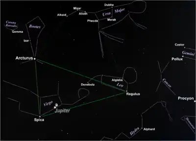 The Spring Triangle with Arcturus, Spica, and Regulus plus (May 2017) Jupiter and, "incidentally", the Moon. The line between Spica and Regulus nearly represents the ecliptic, the path of the sun and planets. Arcturus and Spica are found along an arcing path off the handle of the big dipper, while Regulus can also be found from the big dipper by pointing from down from the third and fourth dipper stars.