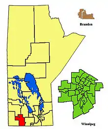 Outside of the City of Brandon, communities in the constituency include Glenboro, Holland, Oak Lake, Rivers, Souris, and Wawanesa.[3] The constituency also includes the part of CFB Shilo that is within the Municipality of Glenboro - South Cypress.