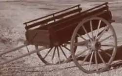 An Australian spring cart was a simple cart designed for carrying goods and did not have seating for driver or passengers. The driver usually sat on the sacks or goods carried. The shafts were wider than usual to accommodate a draught horse or a part bred one.