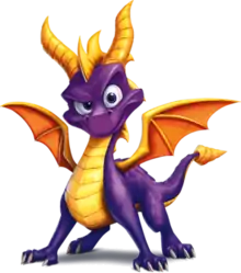 Spyro is a cute, energetic, young, male, purple dragon. He is known for his ability to defeat enemies by breathing fire and charging at them, and his ability to glide to otherwise unreachable areas in the game world. Spyro is often accompanied by his best friend Sparx, who is a dragonfly.
