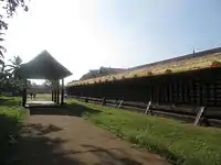 Built in the silent and picturesque land on the banks of Manimala river, this icon of Kerala temple architecture, covers an area of 8.5 acres and ranks first among the temples of old Travancore state in terms of area inside the compound wall.[2] The temple is surrounded on all sides by 12 feet, tall 566 feet long, 4.5 feet thick red granite compound walls with a two-storied gopuram (gate tower) on each side.[5] This huge wall was built in 57 BC and is believed that it was completed in a single night by bhoothagana (servants) of The Lord. Outside eastern wall a big pond covering 1.5 acres is seen in north-eastern direction with a copper flagstaff on its southern bank. A platform for performing kathakali is seen just in front of the eastern entrance. Inside the wall pradakshina veethi or outer circumambulation path is seen with four small aankottils (places where the deity is taken out and kept for worship inside temple wall) and a big one on south-eastern corner. South-east to this an oottupura or dining hall is seen which is built in all other temples only on northern side and this is unique to Sreevallabha temple only.[14] Temple auditorium and administrative offices can be seen next to this. Smaller shrines for lord Ganapathy and Ayyappan and another auditorium are seen in south-western side. The position of kshethra palan or temple guard which is strictly built in all temples on northern side is found here just in front of Ganapathy's shrine i.e. on southern side which also is another peculiarity found nowhere else.[1] The sacred fig and mango trees beneath which sage Durvasa meditated is found near Ayyappan shrine. Just outside the western gopuram, Sankaramangalth Illam where Sreedevi Antharjanam lived is seen well preserved for the initiation of any pooja in the temple. Northern gopuram is closed always and is opened only for Uthra Sreebali festival. North east to pradakshina veethi, a self originated pond called Jalavanthi or Khandakarna theerthem which is believed to contain 64 hidden idols of the Lord is seen. It is for only the use of priests. Spot where sage Vedavyasa and sage Durvasa disappeared is found on its eastern bank and resting building for the priests on southern side. North to the temple a roofless shrine dedicated to kurayappa swamy is seen. No pooja is done here, but only banana as naivedyam. The bahir bali vrutham or outer circle of sacrificial stones is built inner to bahir pradakshina veethi. The temple koothambalam (stage) was destroyed by fire in 1915.[11] The most highlighted construction of the temple is the Garuda dhvaja sthambam or flagstaff of Garuda,[1][14][15] the majestic eagle mount of lord Vishnu. This monolithic structure is completely built from black granite and elevated 53.5 feet above the ground with its lower end touching water table.[16] Constructed in 57 BC, this structure was also built in a single night along with the outer wall. And an amazing fact is that no black granites can be found in an area ten miles around the temple. A 3 feet massive idol of Garuda is placed on the top of it facing the main sanctum. Since this flagstaff started slanting and reached its current position, a three tiered copper roofed construction has been made all around it to prevent further slanting. West to this, currently used golden flagstaff can be seen.[17]