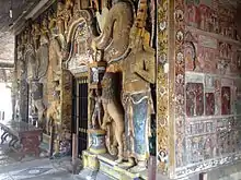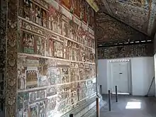 The outer walls of the inner chamber contain a large number of narrative paintings arranged in five horizontal bands of nearly 26 inches in height.[4] These bands are adorned with various drawings related to the Buddhism. The upper most horizontal bands of the three walls are illustrated with proclamation of the twenty four Buddhas of the past while the lower band decorated with floral scrolls and lotus petal motif. The middle bands of the walls display the episodes from the life of the Gautama Buddha and Jataka stories. (Khadirangara Jataka, Nimi Jataka, Mahajanaka Jataka, Manicora Jataka and Katthahari Jataka). All the paintings show the features of conventional style of the hill-country (18th century) and the realistic style of the low-country (19th century).