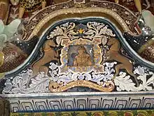 The image house consists of an inner chamber (shrine room) surrounded by an outer shelter. The inner chamber opens towards the south direction and has two entrances, framed with sculpted Makara Thorana (Dragons arches). A portrait of the Queen Victoria has been painted over the right side entrance door in a framed portrait, accompanied by two unicorns. Also some Delftware fragments and VOC coins have been used to decorate the door surface as well as the floor of the image house.
