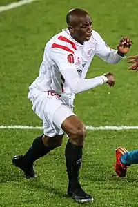 Mbia scored with a back-heel in the first leg of their Europa League semi-final against compatriots Valencia CF on 24 April 2014 in a 2–0 home win.[12] In the second leg on 1 May, he scored the winning away goal with a header in the fourth minute of added time to take Sevilla into the final.[13] Sevilla subsequently won the final in a shootout against Benfica at the Juventus Stadium in Turin on 14 May, with Mbia converting his penalty kick after the match had ended 0—0.[14] On 3 June, Mbia was selected in the 18-man Europa League "Team of the Year" along with teammates Ivan Rakitić, Nicolás Pareja and Beto.[15] At the LFP Awards, he was a nominee for the league's best African player, alongside the Granada CF duo of Yacine Brahimi and Youssef El-Arabi.[16]