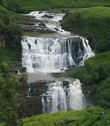 The falls are located along the Kotmale Oya, a tributary of the Mahaweli River, as it cascades over three rock outcrops into a large pool,[2] running through a tea estate, from which the falls derive their name from.[3] The waterfalls consist of two falls called "Maha Ella" (Sinhalese "The Greater Fall"), which is 80 metres (260 ft) high and 50 metres (160 ft) wide and "Kuda Ella", (Sinhalese "The Lesser Fall"), which is 50 metres (160 ft) high and located immediately downstream of the main fall.[4] St Clair's falls are the 20th highest waterfall in Sri Lanka.[5][6]