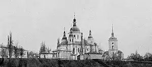 Of the monastic buildings Ivan Hryhorovych-Barskyi constructed within the monastery, his most important construction was a free standing belfry, built in 1760.[2] The belfry combined the idea of a tall campanile with a gate on the ground level and a chapel on the belfry's second tier. The two lower levels of the belfry had some elements of a Ukrainian tripartite church, consisting with the belltower placed over the central part of the nave.[2] This architectural combination in a belfry with two apse-like lower elements on each side. The original roof above the belfry's chapel was a stepped-hipped roof, which was popular at the time.[2] After the fire of 1849, the roofs over the chapel and the cupola were modified from the original. After the Ukrainian SSR's decision on the demolition of the belfry in 1936, the belfry was destroyed a year later, to be used as bricks in construction projects.