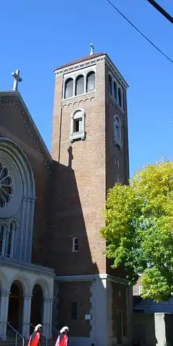 The Church of St. Dominic is a Roman Catholic parish church under the authority of the Roman Catholic Archdiocese of New York, located at 1739 Unionport Road, Van Nest, Bronx, New York City.[1] The parish was established in 1927. The Romanesque Revival was built 1925 to the designs of Bronx-native architect Anthony J. DePace of the firm DePace & Juster.[2] In May 2011, two of the three bells were removed in order to service the wooden supports which were waterlogged and had seepage problems. The goal is to replace the wooden supports and return the bells to their original location.[3] The expected restoration cost of the bells is estimated at $30,000.[4]
