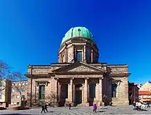 Franz Ignaz Michael Neumann, son of Balthasar Neumann, drew up plans for the new building. The foundation stone was laid on 19 May 1785. Neumann died on 29 September 1789, and responsibility was taken over by Peter Anton von Verschaffelt. However, a large overrun in costs led to the resignation of Verschaffelt in 1789. Eventually topping off was completed in 1802 and in 1803 the dome was crowned with a golden cross.