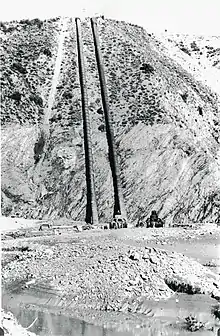 It was during the process of building the aqueduct that Mulholland first considered sections of San Francisquito Canyon as a potential dam site. He felt that there should be a reservoir of sufficient size to provide water for Los Angeles for an extended period in the event of a drought or if the aqueduct were damaged by an earthquake. In particular, he favored the area between where the hydroelectric power plants Powerhouses No. 1 and No. 2 were to be built, with what he perceived as favorable topography, a natural narrowing of the canyon downstream of a wide, upstream platform which would allow the creation of a large reservoir area with a minimum possible dam.[9] A large camp had been set up to house the workers near this area, and Mulholland used his spare time becoming familiar with the area's geological features.