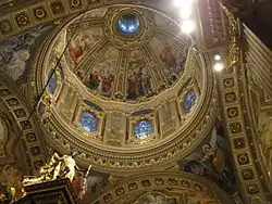 Something which one may not expect to see in a traditionally classic Baroque building, such as St George's, is a Byzantine style chapel. The cornerstone was laid in 2002. Today this chapel holds the Blessed Sacrament and the Holy Cross of the Basilica. In 2004 work started on the building of the new dome of the chapel. The chapel was blessed by the then Archpriest Dr Joseph Farrugia on July 10, 2005.[6] This unusual style was chosen for its cultural association with the Christian Churches of the East. The aim was to help instil in the Catholic faithful the awareness that the universal Church breathes through two lungs, that of the Western Church as well as that of the Eastern-rite sui-iuris Catholic Churches in communion with Rome.. The chapel and the dome were built to the designs of Vince Centorrino. The dome includes eight Byzantine style windows and is to be decorated with gold mosaic. The floor of the chapel is covered with porphyry slabs.[7] The chapel also includes a solid silver tabernacle, 7 feet tall. It was built in the form of the ancient ciborium that was in use in St George's up to the sixteenth century when it was lost but retrieved again when it was found buried in the old façade of the basilica, some two centuries later.[8]