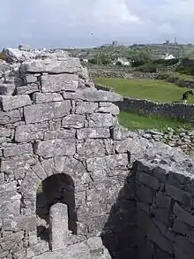 The site is believed to have been in use since the 6th century. According to traditional tales, Saint Gobnait fled from County Clare to Inisheer to escape a family feud. Later, an angel appeared to her and told her to return to the mainland and go south until she saw nine white deer; she settled at Ballyvourney and built a religious community.[5] The remains of her beehive cell are said to be on Inisheer. The stone church was built in the 11th or 12th century.[6]
