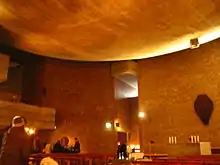 St. Hallvard's monastery and church in Oslo, designed by the architects Lund & Slaatto, has three sections: the monastery, parish offices, and the church, surrounding a circular central nave. The building has three levels, built of brick and concrete exposed both to the interior and exterior.[1]