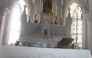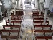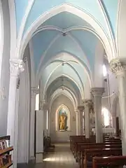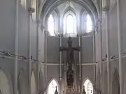 The imposing gate and the flowered garden, which is large welcome visitors who approach the church. The wooden gates with the windows create an atrium that blocked the direct entry into the church and keep the general information of the church on the opposite wooden wall. When visitors enter the church the detail of arches and the ornament columns that has the cross symbol on them attract the attention, which connect the arches each other. Moreover, the colored windows, which are called as stained glass as an architecture term, create an exciting effect on visitors. Also, the high ceiling with the great wooden cross symbol that is above this ceiling and the sculptor of Isa located behind the cross makes the visitors more exciting and feels like they have new and amazing experience. There is a cabin that is used to confess next to narrow spiral stair while there is a sculpture, which are one of the sculptures in some corner and walls in church. Some sculptures placed all around the church that are unhidden although, some of these sculptures are hidden inside the aisle and sides of the transept to emphasize these sculptures. Especially , miniature model of the faced made from plaster is attractive which is located on the wall of apse, behind the marble altar. The wooden seating areas, which are placed near the extended approach, reflect the importance given to religion by architect and the community at that time. In addition, the type of clearstory windows creates a stir on the visitors emotion while they ware walking towards the altar.
