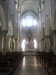 There is big gallery between small galleries, which are located on both sides of church. This situation shows that the church sits on the Basilica plan. Also, architect Raymand Charles Péré inspired by Gothic architecture style. The landing, which is on front of the door, is remarkable. Moreover, The cross vaults emphasize the architectural richness that belongs to the roof system. 2 different type of marble are used in interior decoration. One of them is Italian marble (Carrara) that was used on altar located at apse while other was used on columns and the head of these columns located at nave, which is Marmara marble. There are many sculptors that have significant mean in the church. The most important one is the first religious martyr of the city called St. Polycorpos. There is an org at the upper part of the church that used to pray by women. When plan of church are examined, obviously seen that aisle forms the body of the form while the transept forms the arms of the cross.
