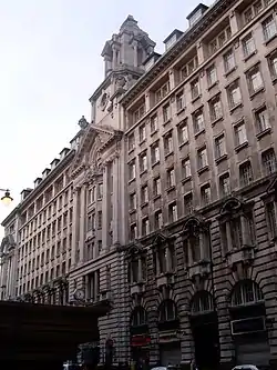 The building is Edwardian Baroque in style, has a Portland stone exterior and reaches a maximum height of 60m. The architects Clegg, Fryer & Penman designed the long façade with three slightly protruding pavilions with grossly inflated pilasters and pediments; in the centre the principal pediment is topped by a stumpy tower which breaks through the cornice line. The lowest third of the façade is emphasized by rustication and by having a more elaborate arrangement of windows.[6]