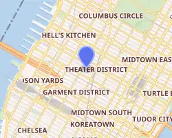 The St. James Theatre is on 246 West 44th Street, on the south sidewalk between Eighth Avenue and Seventh Avenue, near Times Square in the Theater District of Midtown Manhattan in New York City.[3][4] The land lot is nearly rectangular, with a protrusion on the eastern end. The lot covers 12,858 square feet (1,194.5 m2), with a frontage of 124.5 feet (37.9 m) on 44th Street and a depth of 100.42 feet (31 m).[4]