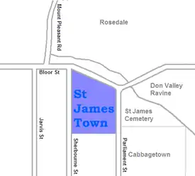 St. James Town (sometimes misspelled St. Jamestown) is a neighbourhood of Toronto, Ontario, Canada. It lies in the northeast corner of the downtown area. The neighbourhood covers the area bounded by Jarvis Street to the west, Bloor Street East to the north, Parliament Street to the east, and Wellesley Street East to the south.