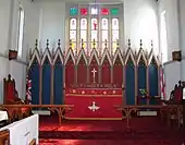 The principal feature of the sanctuary is a colourful painted wooden reredos dating from the 1870s. The church has an unusually wide centre aisle so that the troops attending services could march out four abreast.[2] Each row of pews was built by various members of the military and has its own individual design. The pews at the front of the church have more ornately carved ends as they were intended for officers.[2]