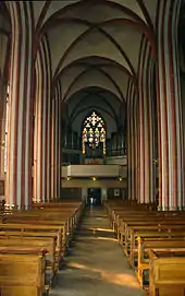 The church building is a particularly clear example of the Brick gothic style. All three naves were covered by a single especially large pitched roof. The west gable's extraordinary form and size derives from this design. It is divided into three stories, which each contain pointed arch windows arranged in pairs. The base line of these windows is a line of ornamental brickwork. At the apex of the gable is a cruciform window with a star of David. This has been in place since 1878, when the roof was repaired and the new gable installed, surmounted by a stone cross. The star of David was probably included as a result of horror vacui. No other symbolic significance at all is attested in church documents. One can, however, suggest that the star of David is symbolic of the Old Testament and the cruciform shape is symbolic of the New Testament. The two belong together and form the foundation of the church.