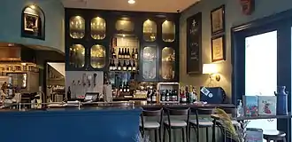 The restaurant was designed by Craig Straghetta's Vancouver-based studio Ste. Marie, which designed Poirier's earlier restaurant Ask For Luigi, as well as other Vancouver restaurants such as Kissa Tanto and Botanist.[10] Poirier asked for a space that did not feel designed and looked "like it's always been there", so Straghetta worked to invoke the feeling of a cozy rural home "turned into a restaurant in the middle of the city".[11][12] The original colour scheme for the restaurant used cream and faded yellow, but was changed to a blue and green palette after the designers sampled the proposed menu.[12] The French-speaking staff and French background music are intended to make patrons feel as if they are not in Vancouver. Reviewers have described the environment as having a similar feeling to eateries in Montreal or Quebec City, Quebec.[1][4][13]