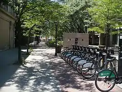 Market Lane Park is located on the west side of the North Market Building and St. Lawrence Hall. With the closure of (formerly West Market as well as Market Square as Market Street ran on southside - now known as The Esplanade) Market Street between King and Front Streets, under City of Toronto By-laws 291-67[19] and 40-70,[20] the area was converted to pedestrian use only. Additional landscaping features like water fountain (south end at Front Street), rows of trees, flower beds and sculpture (at north end on King Street) have been added. Market Square condominium buildings were constructed along the westerly boundary in the early 1980s.[21]