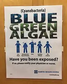 Harmful algal blooms have been documented in the St. Lucie River since the early 1980s.[8] These blooms occur as the result of nutrient pollution and degraded water quality, and their growth is further stimulated by high temperatures.[9] In 2016, the river experienced the flourishing of extensive algae blooms, along with Lake Okeechobee and the Caloosahatchee River.[9] The cyanobacteria, or blue-green algae, causes numerous severe health consequences for the marine ecosystem as well surrounding human populations. Blooms result in reduced dissolved oxygen concentrations, alterations in aquatic food webs, algal scum lining the shores, the production of compounds that cause distasteful drinking water and fish flesh, and the production of toxins severe enough to poison aquatic as well as terrestrial organisms.[10] Blooms have been reported throughout the continental United States, and resulting cyanotoxins have been associated with human and animal illness and death in at least 43 states.[11] Most cyanobacteria produce the neurotoxin beta-N-methylamino-l-alanine (BMAA) that has been implicated as a significant environmental risk in the development of neurodegenerative diseases such as Alzheimer's disease, Parkinson's disease, and Amyotrophic Lateral Sclerosis (ALS).[12] The cyanobacteria has also been linked to liver cancer, chronic fatigue illness, skin rashes, abdominal cramps, nausea, diarrhea and vomiting.[13]
