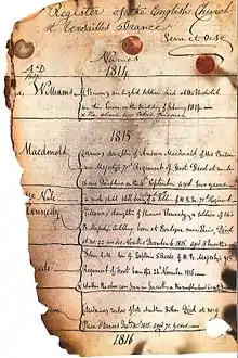 The oldest document we have is the Church Register for 1814, which records the death of a British prisoner of war, Brecon Williams, "at midday of the 7th February at the hospital in this town". The entries for 1815 refer to relatives of military personnel, mainly from His Britannic Majesties 71st Regiment of Foot, which became The Highland Light Infantry, and formed part of the ‘army of occupation’ camped near to Versailles after the Battle of Waterloo. This register shows that the church has no name and is referred to both as the ‘English Church at Versailles’ and the ‘British Episcopal Church Versailles – Seine et Oise’.It is not clear how an English Church continued to operate prior to 1815, during the period of the Napoleonic Wars. Perhaps it had diplomatic immunity?[2]