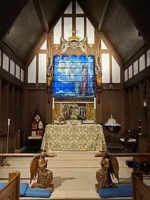The chapel features elements taken from the Tuxedo Park homes of Richard Mortimer and Henry Morgan Tilford.[93] These include an Italian marble hearthstone taken from Mortimer's since-demolished home "Mortemar" that now serves as the chapel's altar[95] and multiple stained glass fragments that date from as early as the 16th century, also taken from Mortemar.[96] The chapel was renovated in 2015.[43]