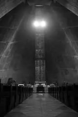 To this rhomboid volume other secondary constructions are added, including the baptistry and the baptismal font. The rectangular shapes contrast with the symbolic character of the cathedral. The bell tower is 61.6 m (202 ft) high, standing a short distance away from the main building. The exterior cladding is made of stainless steel.[4] In 2004 a large organ built by Italian firm Mascioni was installed.[5]