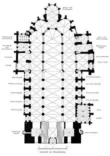 It is built as a three-aisled basilica with side chapels, an ambulatory with radiating chapels, and vestibules like the arms of a transept. The westwork has a monumental two-tower façade. The height of the towers, including the weather vanes, is 124.95 metres (409.9 ft) and 124.75 metres (409.3 ft), respectively.