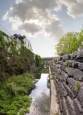 In the riverbed and along the banks, limestone was close to the surface and could be quarried for building materials. Many 19th century limestone structures survive: churches, commercial blocks, and private homes. They have given St. Marys its current nickname: Stonetown.[5]
