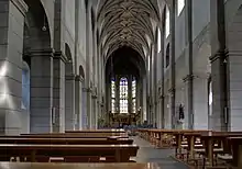 The basilica has therefore been thoroughly transformed during a long-drawn-out exercise in cleaning up and alteration. The crypt has been extended by a further two bays and provided with new means of access. The place of the veneration of Saint Matthias the Apostle, as well as the altar space, have been adapted to modern requirements. Stable choir stalls have been built for the monks' choir. A lift has been installed for easier access to all levels. On 10 December 2007 during a solemn pontifical office with Bishop Reinhard Marx the bones of the Apostle Matthias in their shrine were translated to their final location in the crypt,[2] with the solemn dedication of the altar planned for 24 February 2008. The conclusion of the building works with an overhaul of the electrics and a final paint job is not presently possible due to financial constraints.